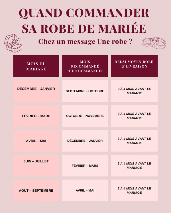 Pour être sûre de recevoir votre robe à temps, nous recommandons de passer commande au moins 3 à 4 mois avant le mariage.