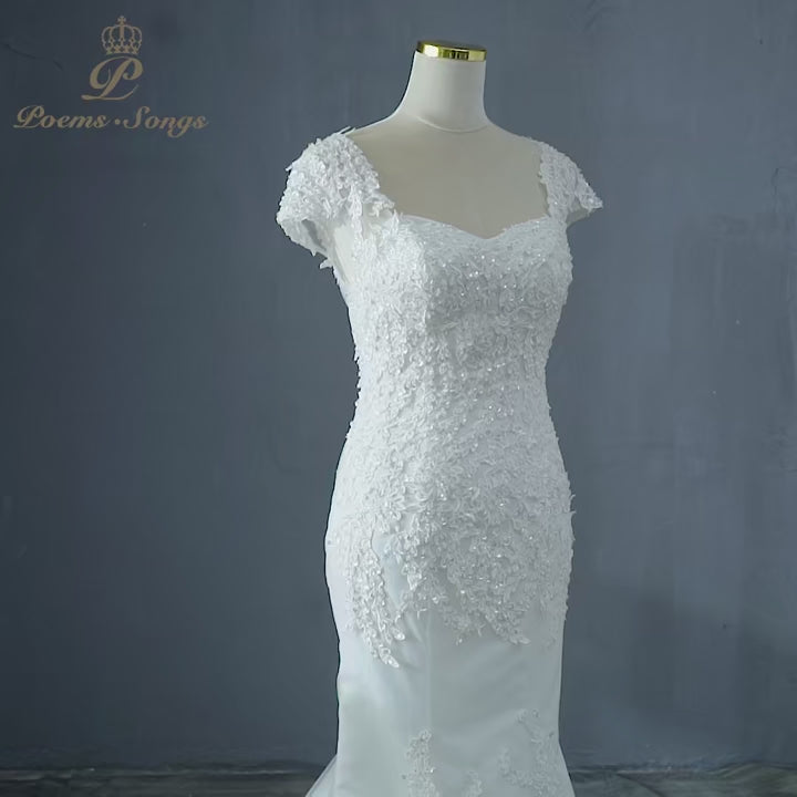 Élégante et raffinée, la robe Novia sublime la silhouette grâce à sa coupe sirène qui épouse parfaitement les courbes avant de s’évaser délicatement au niveau des genoux. Son corsage en dentelle délicate apporte une touche romantique et féminine, tandis que les manches courtes en dentelle offrent un confort et un charme intemporel.